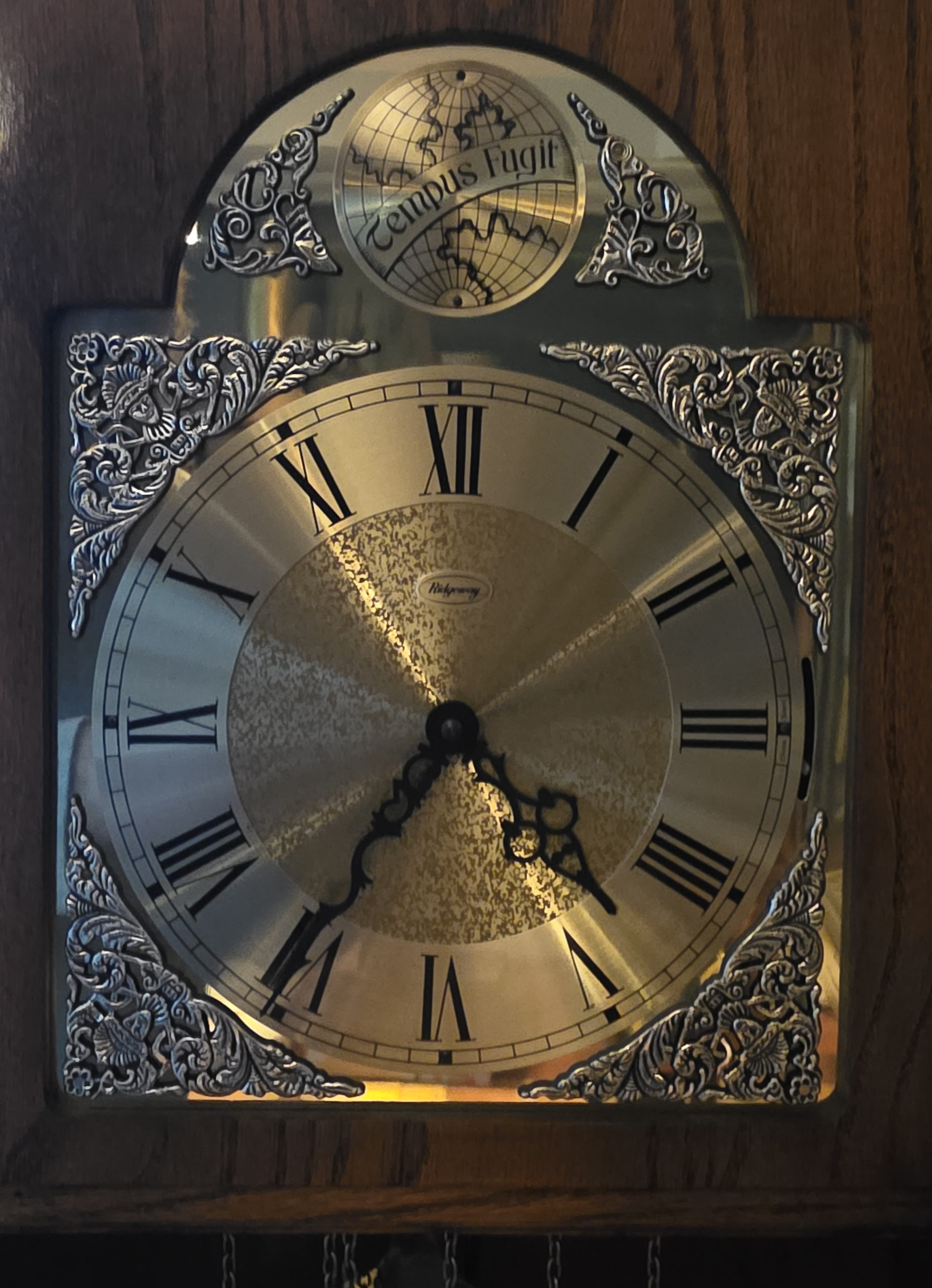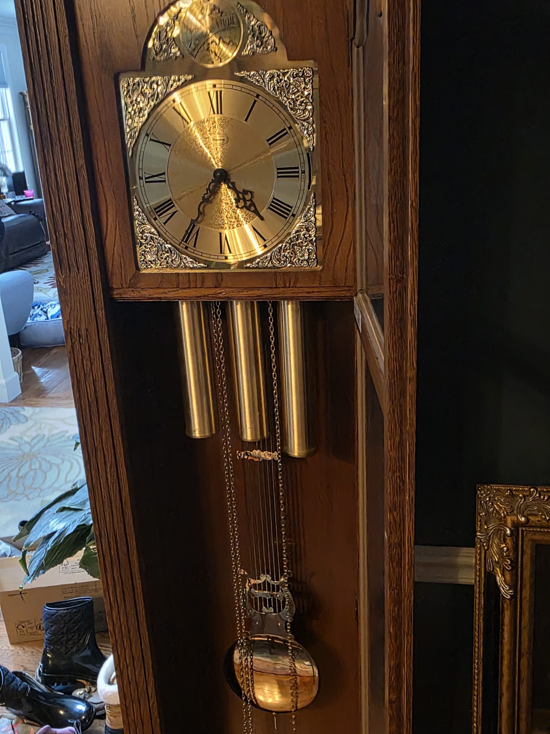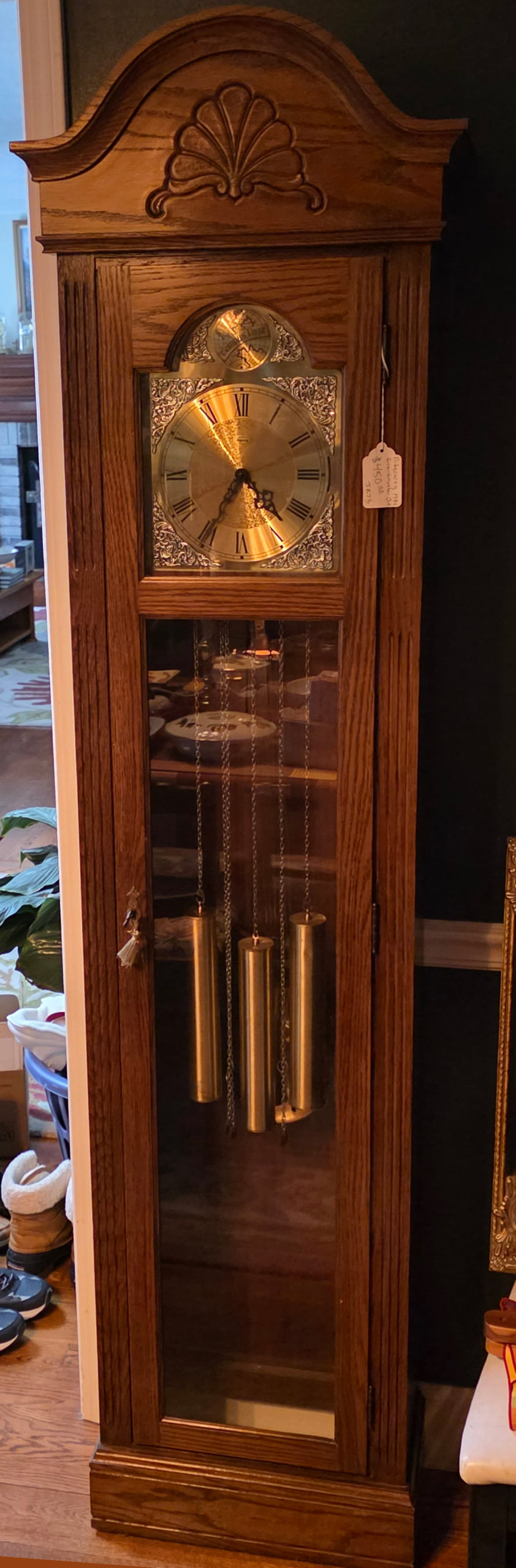 This is an American Ridgeway grandfather (tall case) clock with Westminster chime, produced in the late 20th century (circa 1980sā1990s). Ridgeway clocks are known for their solid cabinetry, reliable German movements, and traditional longcase styling.