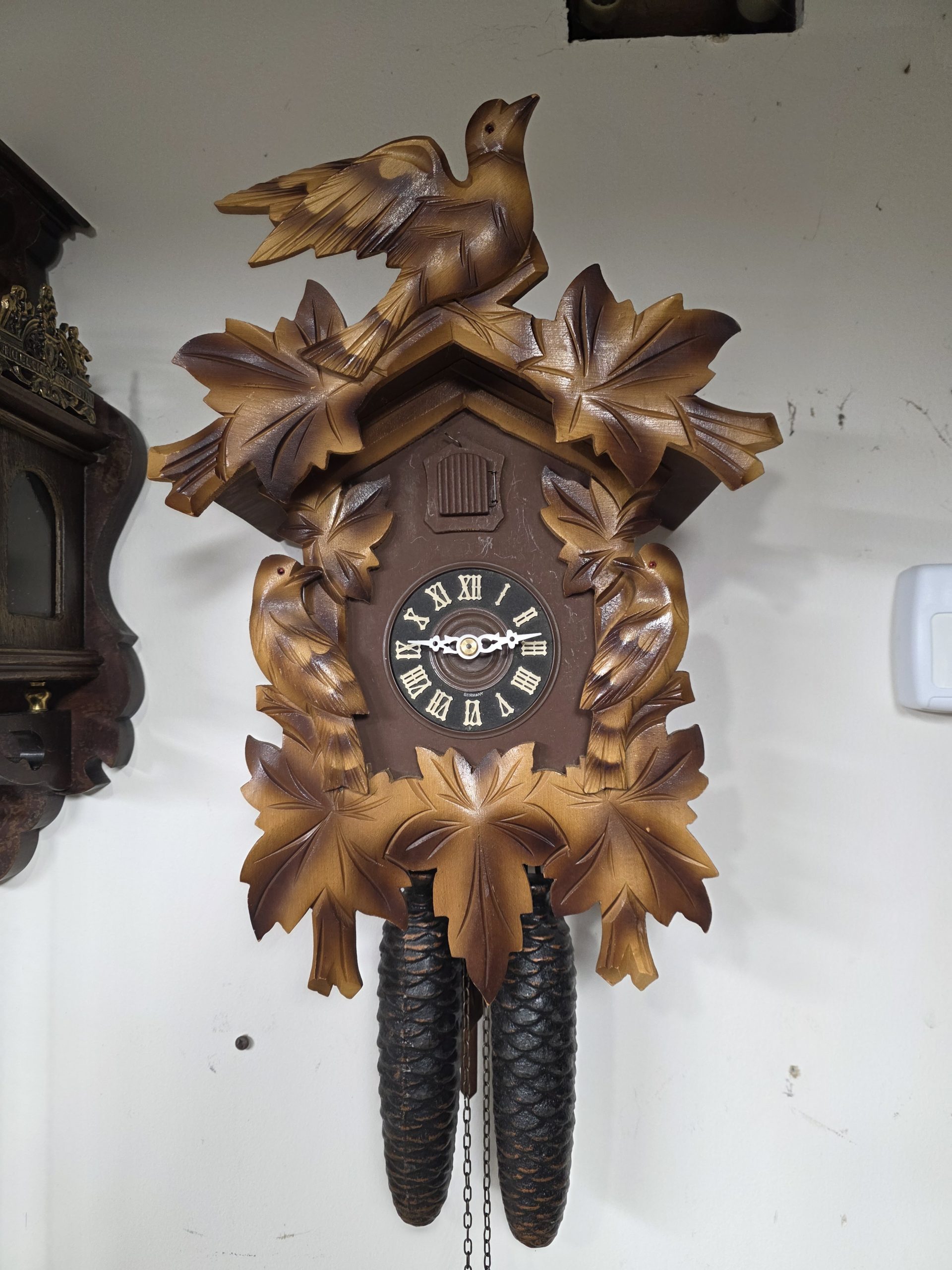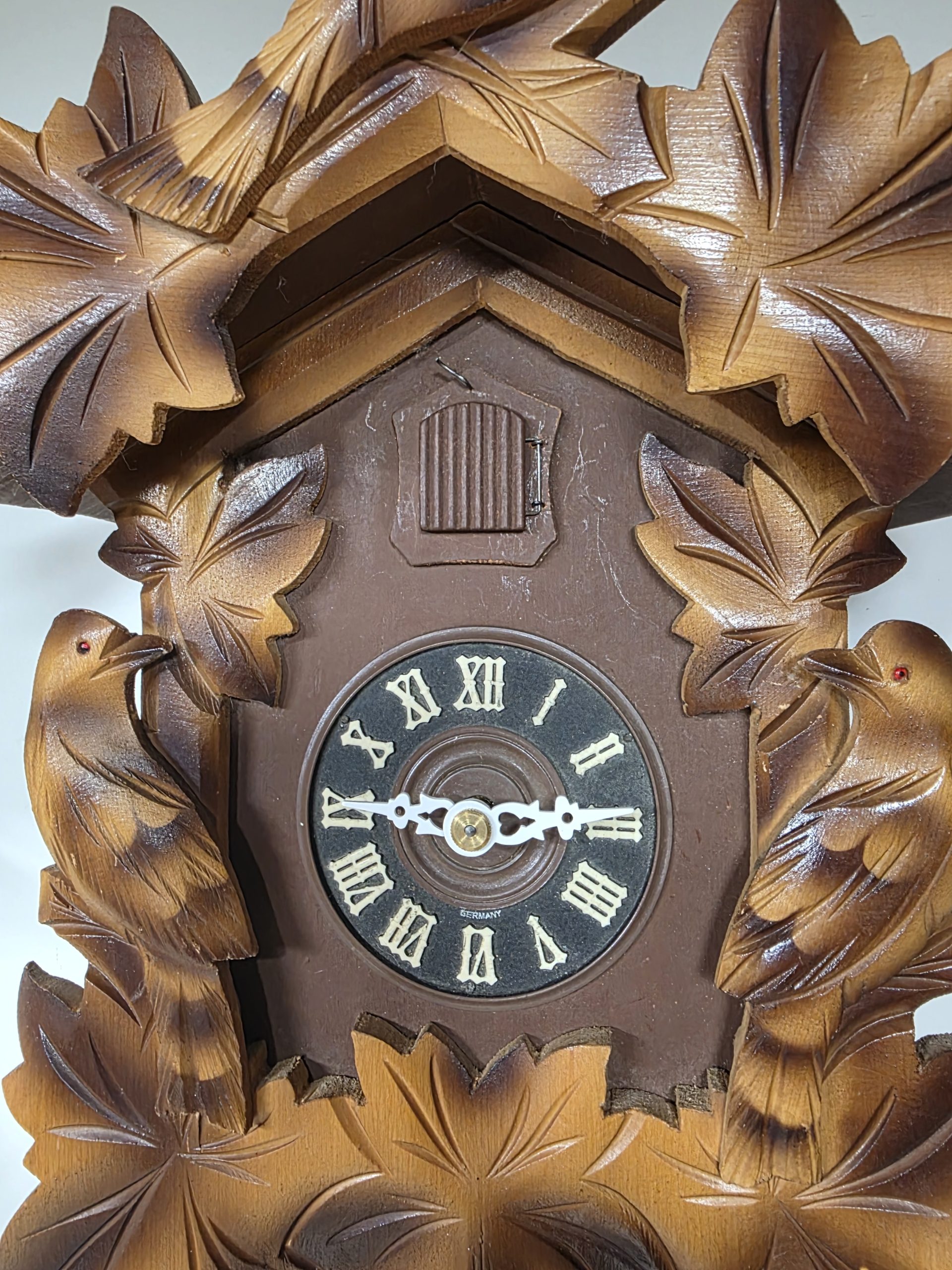 Hand-carved in the Black Forest region of Germany, this classic leaf-and-bird (Jagdhaus/Chalet-style) cuckoo clock features a linden wood case adorned with carved leaves and birds. It has a Roman numeral dial with ornate hands, a chain-driven mechanical movement, and two pinecone-shaped weights. The cuckoo emerges from the door above the dial on the hour. Likely produced between the 1950s and 1970s, it is believed to house a Regula mechanical movement and operates as either a 1-day or 8-day clock, depending on winding frequency.