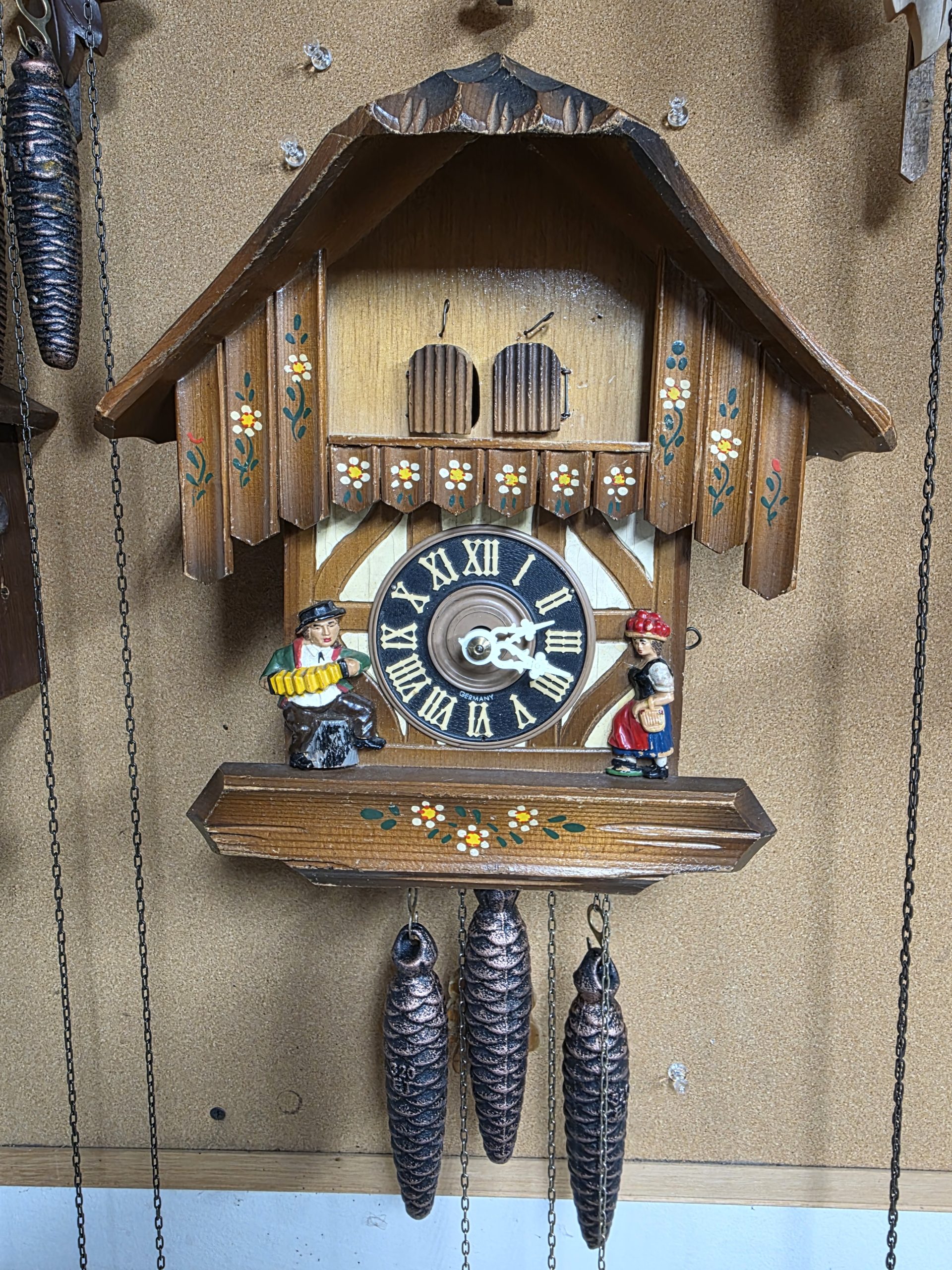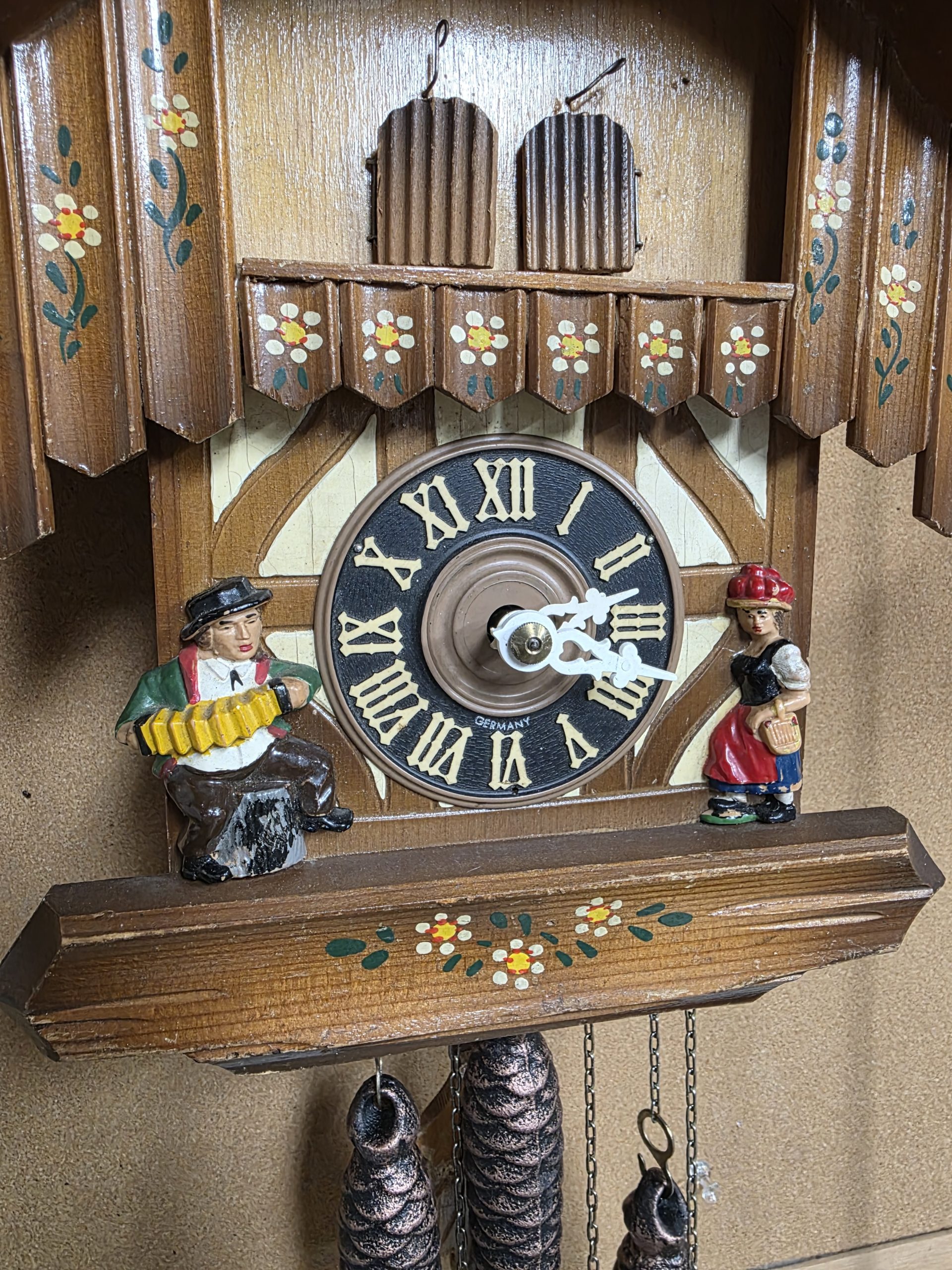 • Painted floral decorations typical of mass-produced but authentic Black Forest clocks